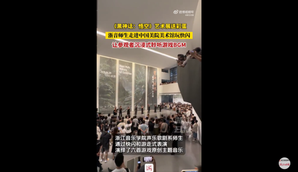 #美院和音乐学院的神仙合作# 7月6日晚,浙江杭州,《黑神话:悟空》艺术展送音乐彩蛋,浙音师生走进中国美院美术馆玩快闪,演绎了六首游戏原创主题音乐,让参观者看展之余,沉浸式聆听现场演绎的游戏BGM。